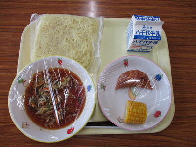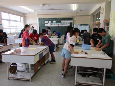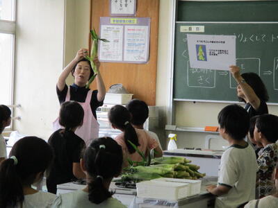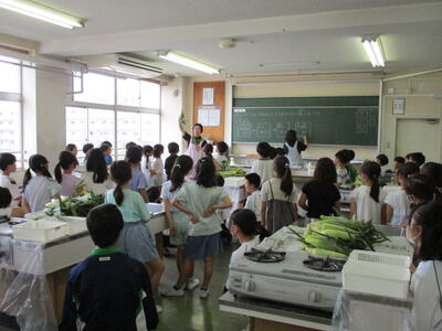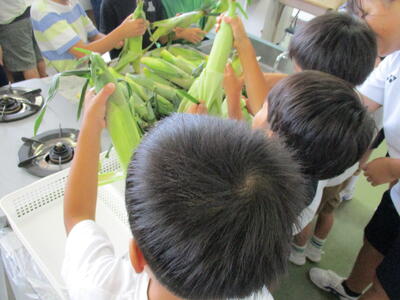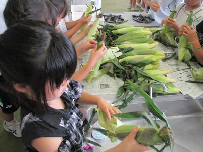 2年生が福栄中学校に行き、トウモロコシの皮むき体験をしました。栄養教諭の先生からトウモロコシのことを教わり、その後、福栄中の1年1組の生徒にサポートしてもらいながら、一生懸命皮むきをしました。皮むきしたトウモロコシは茹でて給食に提供され、おいしくいただきました。