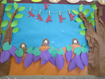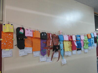 1年生の図画工作の作品です。おもしろい生きものたちが並んでいます。