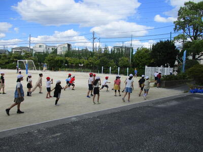 今日の昼休みは、縦割りなかよしグループで外遊びをしました。先週、どんな遊びがしたいかを各グループで相談し、今日は、ドッジボール、鬼ごっこ、だるまさんが転んだなど、仲良く遊んでいました。
