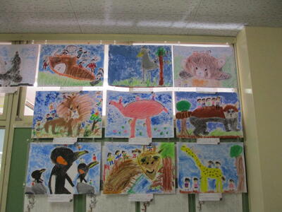 2年生・・・千葉市動物公園で見た動物たちの絵を大きく伸び伸びと描きました。