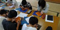 日光彫り体験をしました。あらかじめ考えてあった図案を写し、引っ掻き刀と呼ばれる独特の彫刻刀を使って真剣に彫っていました。