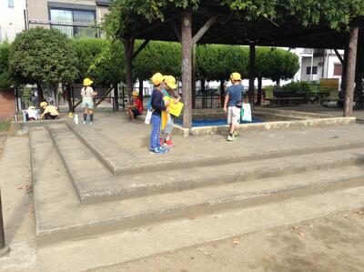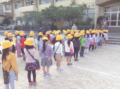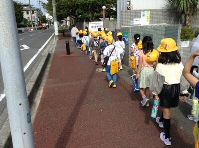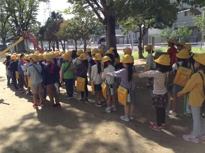 10月18日の2、3時間目に、1年生が生活科の学習で、公園探検に行きました。「ふしぎなもの、すてきなものを見つける」「安全に気を付ける」「おしゃべりしないで静かに歩く」の3つの約束をして、探検に出かけました。