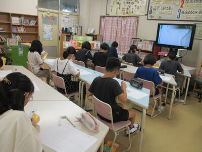 本日、業間休みに、秋の読書月間の企画の一つである辞書引き大会(高学年の部)が行われました。予選は各クラスで行い、代表になった児童12名が決勝に臨みました。図書室には、ピンと張りつめた空気の中、辞書のページをめくる音と鉛筆で書く音だけが響いていました。