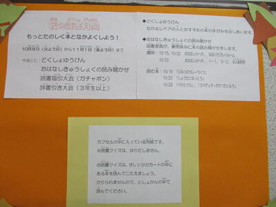 今日から秋の読書月間が始まりました。辞書引き大会、お楽しみガチャポン、図書委員の読み聞かせなど、読書に親しめるようなイベントがたくさん予定されています。