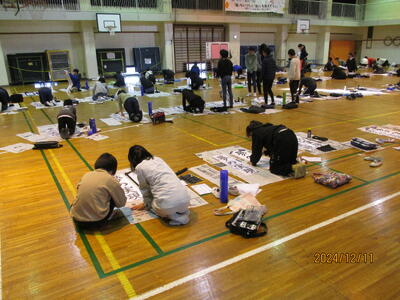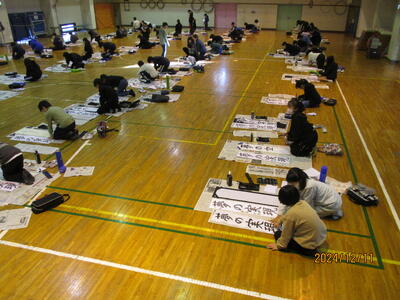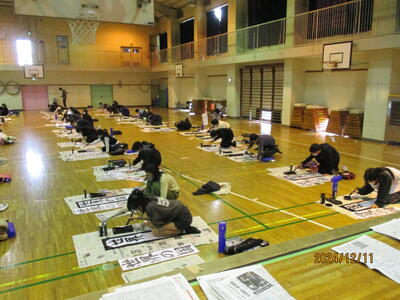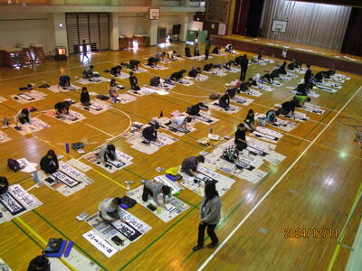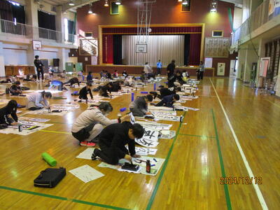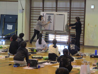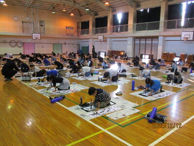 本日、5,6年生が1月の書初め会(席書会)に向けて、練習をしました。外部講師の書道の先生をお招きして、字形や筆遣いなど、ポイントを教えていただきました。