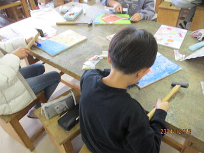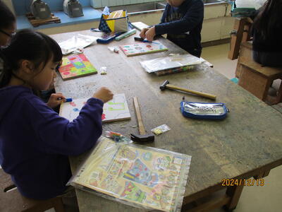 柄を描いた木の板に、金づちでくぎ打ちトントンしながら、ビー玉の通り道を作っていました。