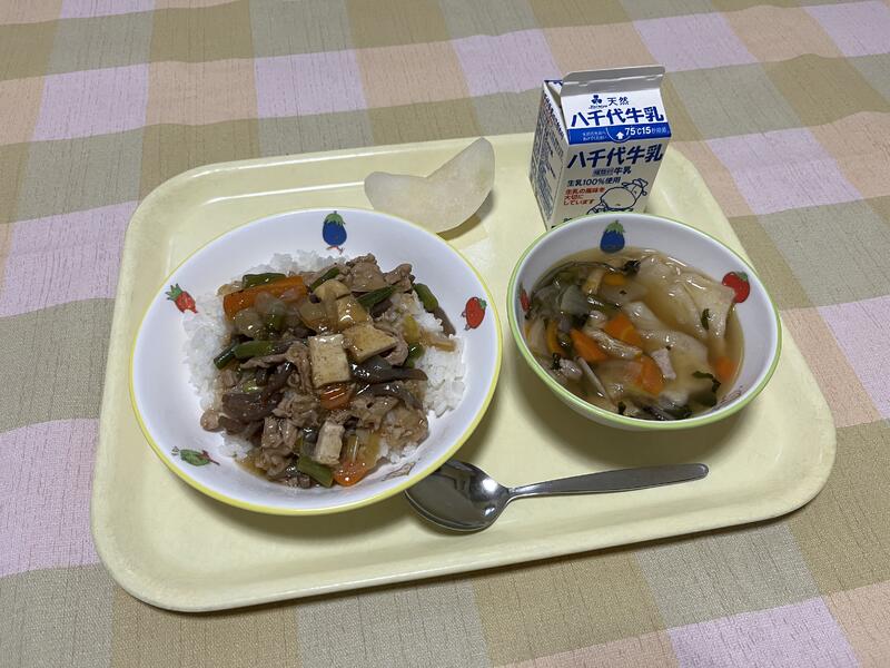 献立:ごはん、豚丼の具、せんべい汁、市川の梨、牛乳