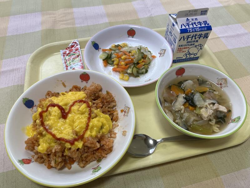献立:オムライス(ごはん・たまご)、フレンチサラダ、ABCスープ、牛乳