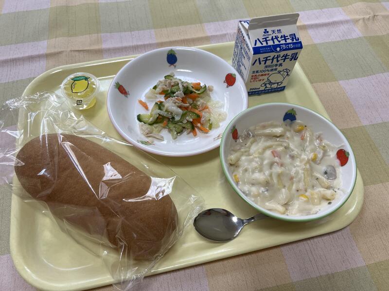 献立:コッペパン、マカロニのクリーム煮、コールスローサラダ、一口レモンゼリー、牛乳