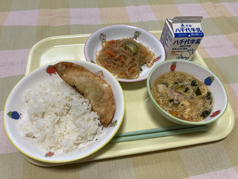 献立:ごはん、揚げ餃子、春雨サラダ、かきたま汁、牛乳