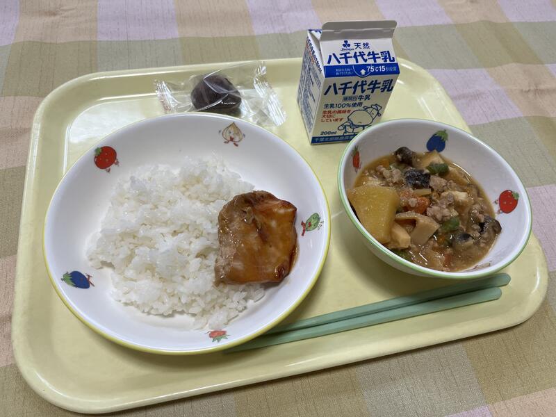 献立:鶏ごぼうごはん、いなだの西京焼き、ごま和え、なめこのみそ汁、牛乳