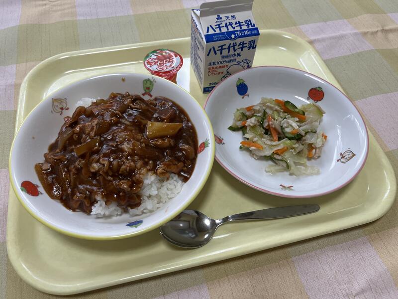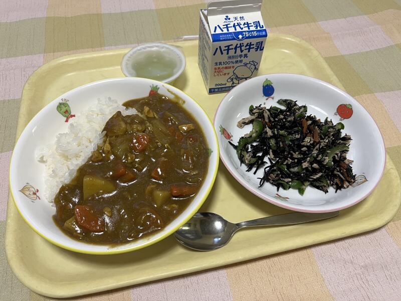 献立:ごはん、チキンカレー、ひじきのマリネ、青りんごゼリー、牛乳