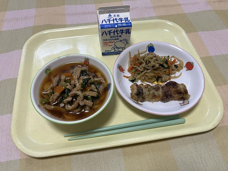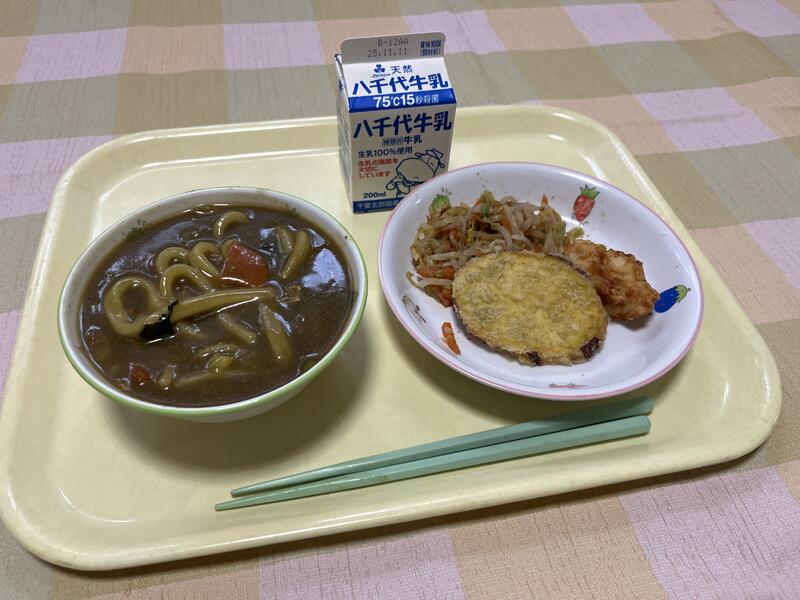 献立:カレーうどん、天ぷら(ささみ、さつまいも)、からし和え、牛乳
