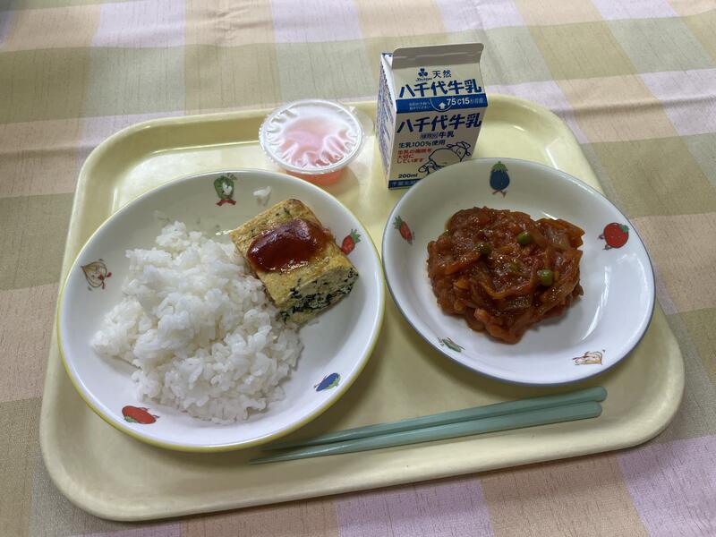 献立:ごはん、鶏肉のトマトソース、おからとひじきのオムレツ、ピーチゼリー、牛乳