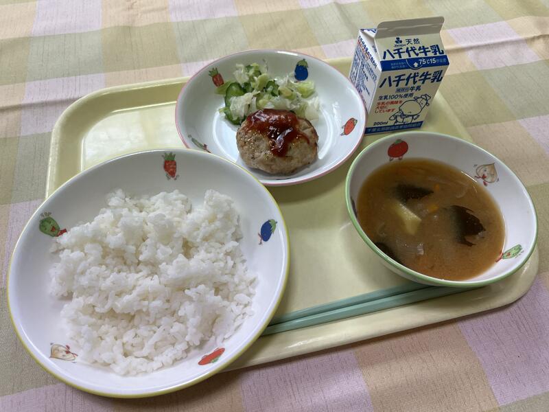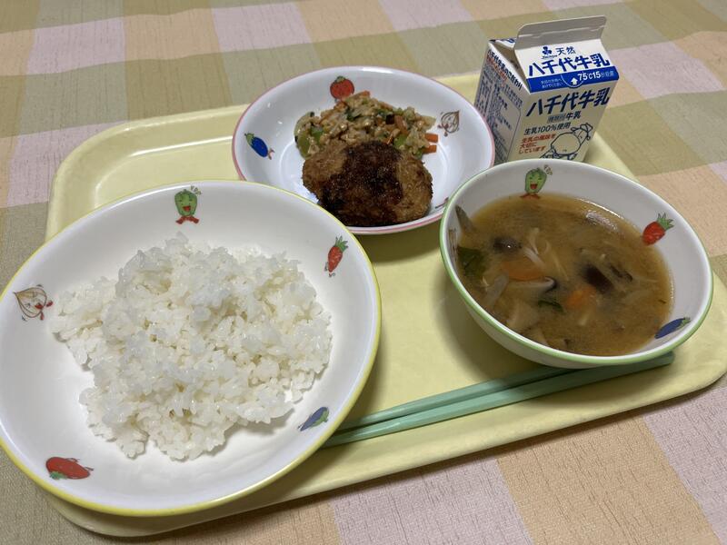 献立:ごはん、ひじき入り豆腐ハンバーグ、キャベツとじゃこの和え物、じゃがいものみそ汁、牛乳