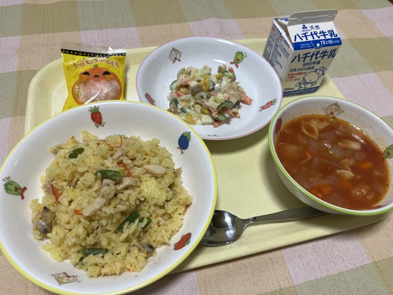 献立:パエリア風ピラフ、生揚げのシーザーサラダ風、ミネストローネ、かぼちゃのクリームもち、牛乳
