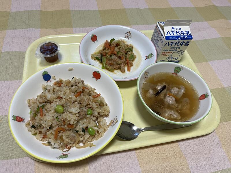 献立:ツナチャーハン、揚げぎょうざ、ナムル、春雨スープ、牛乳