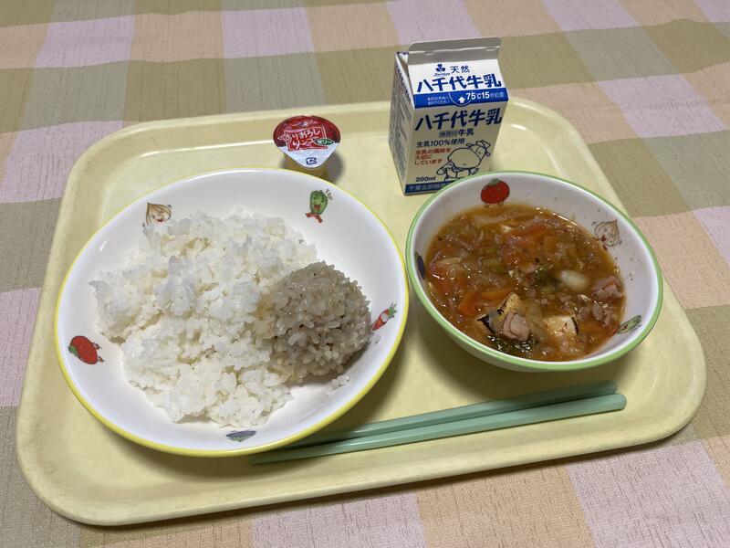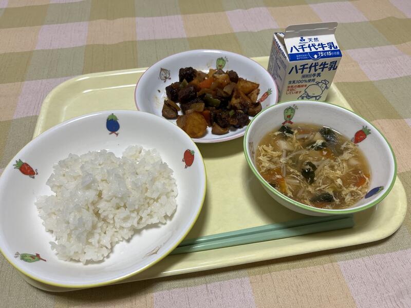 献立:ごはん、マーボーなす、中華風コーンスープ、牛乳