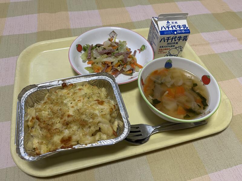献立:こまったさんのグラタン、イタリアンサラダ、ABCスープ、牛乳