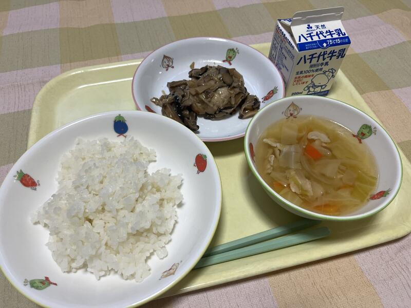 献立:ごはん、きのこソースハンバーグ、キャベツのスープ、牛乳