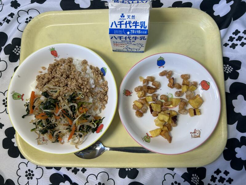 献立 ビビンバ丼、牛乳、ハニービーンズポテト