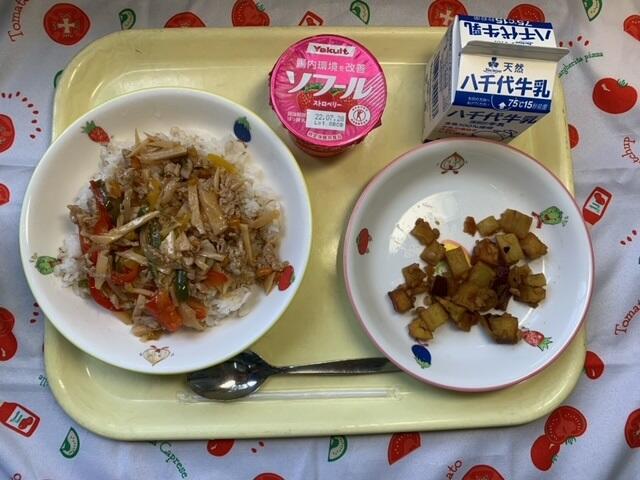 献立:チンジャオロース丼、さつまいもの大豆がらめ、ソフールイチゴヨーグルト