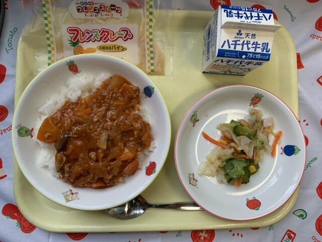 献立:ハヤシライス、ビーンズサラダ、パインクレープ