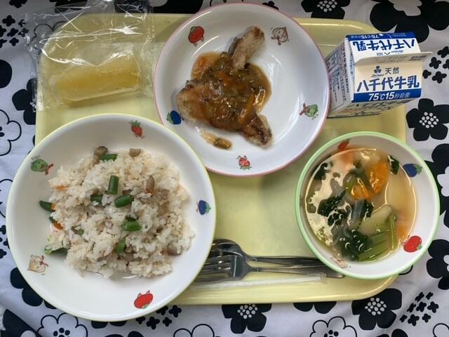 献立:ごぼうピラフ、あじのみそドレッシングソース、米粉マカロニスープ、冷凍パイン