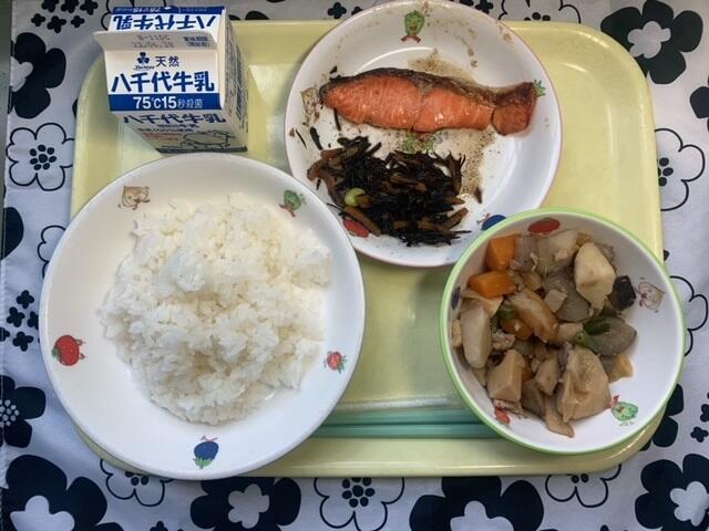 献立:ごはん、さけのさいきょうやき、ひじきのうめに、ちくぜんに