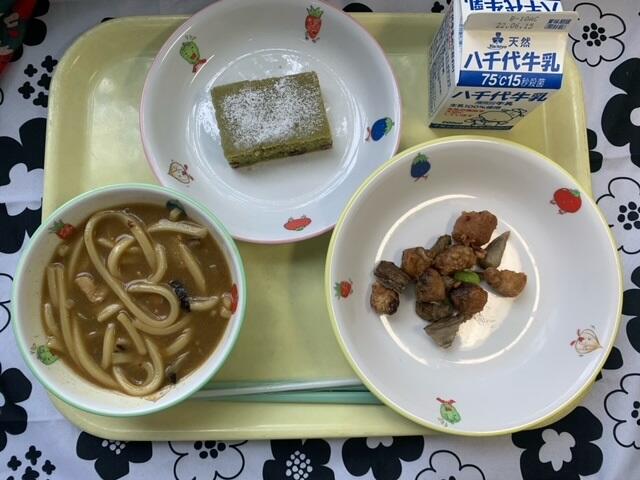 献立:カレーうどん、かつおとごぼうの甘辛揚げ、抹茶と小豆のケーキ