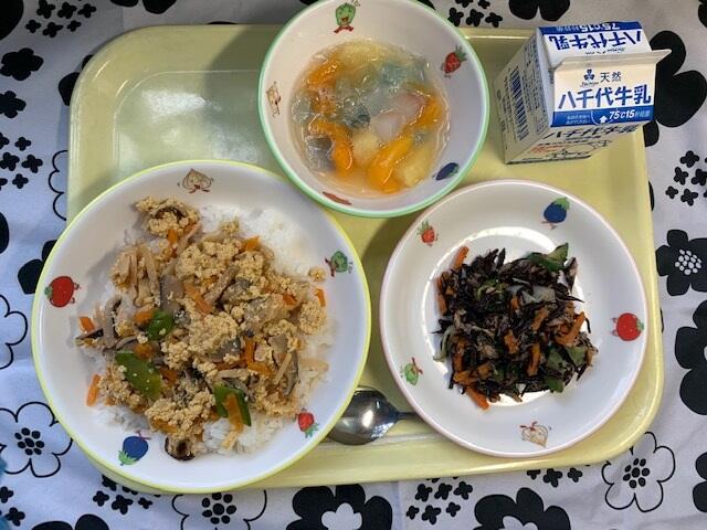 献立:富津丼、ひじきとツナのサラダ、びわいりフルーツポンチ