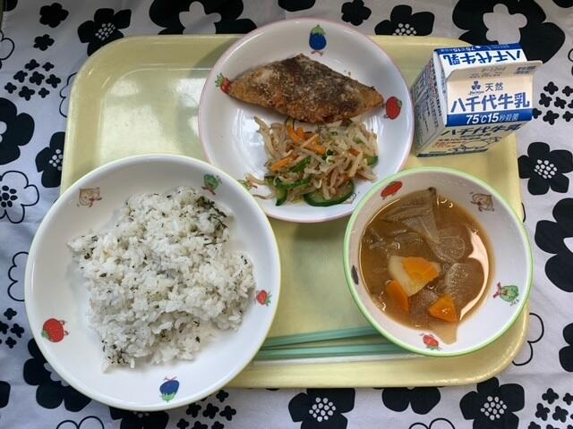 献立:むぎごはん、ぶたのしょうがやき、かみかみサラダ、みそ汁