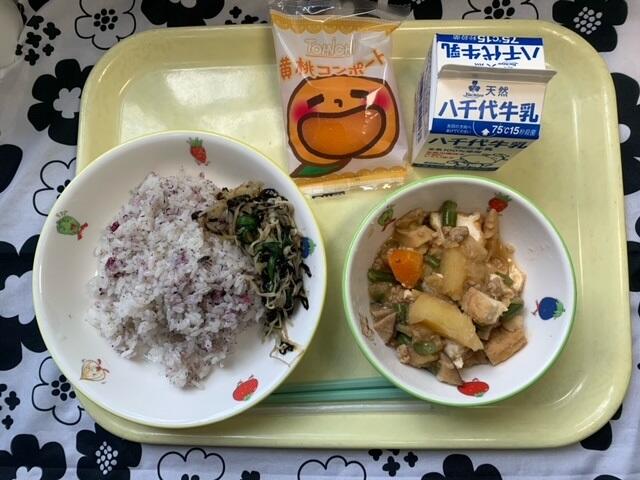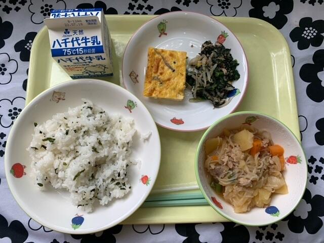 献立:わかめごはん、高野豆腐の卵焼き、海苔酢和え、肉じゃが