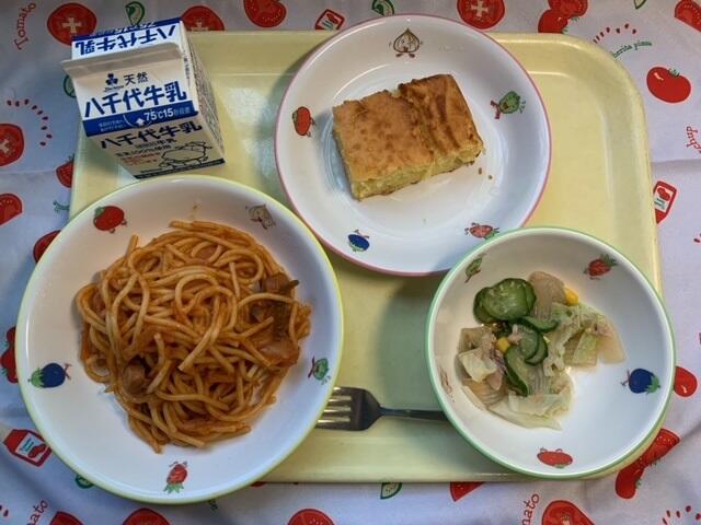 献立:ナポリタン、こんにゃくサラダ、ヨーグルトチーズケーキ