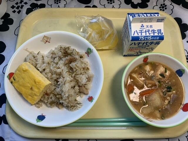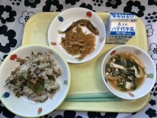 献立:ひじきいり大豆ごはん、ししゃもの南蛮づけ、切り干し大根の煮物、大根と豆腐の味噌汁