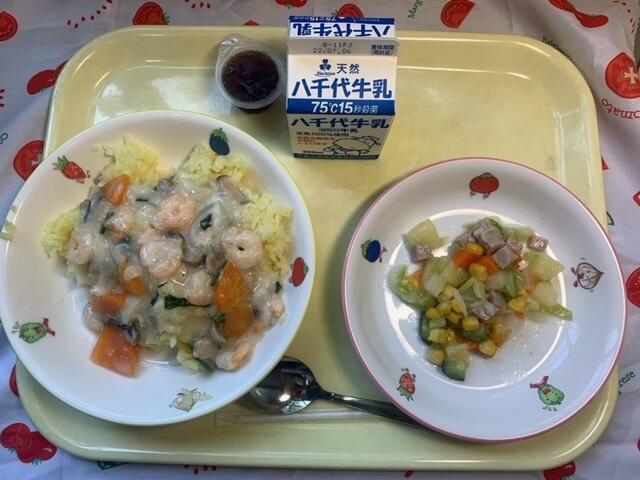 献立:えびクリームライス、マセドアンサラダ、ひとくちぶどうゼリー