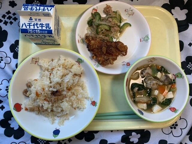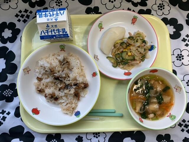献立:たこめし、赤魚のからあげ、ごまずあえ、枝豆団子汁