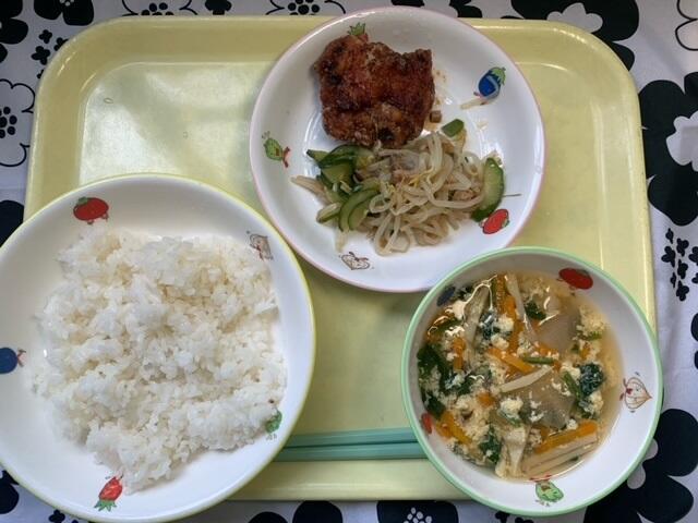 献立:ごはん、韓国風からあげ、ちゅうかあえ、卵と冬瓜のスープ