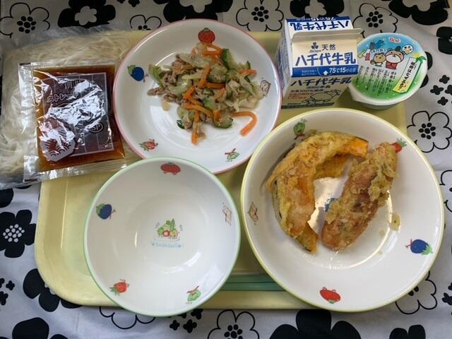 献立:冷や麦、てんぷら(かぼちゃ・笹かま)、焼き肉サラダ、七夕ゼリー