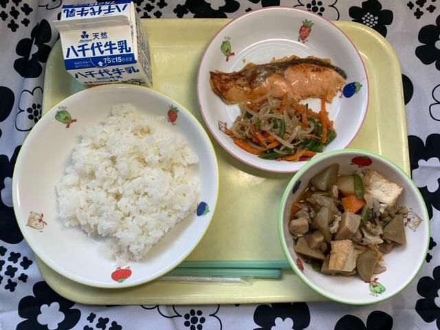 献立:ごはん、さけのさいきょうやき、ひじきのうめに、ちくぜんに