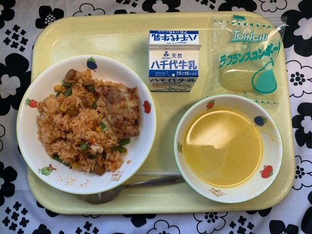 献立:ごぼうピラフ、あじのみそドレッシングソース、米粉マカロニスープ、冷凍パイン