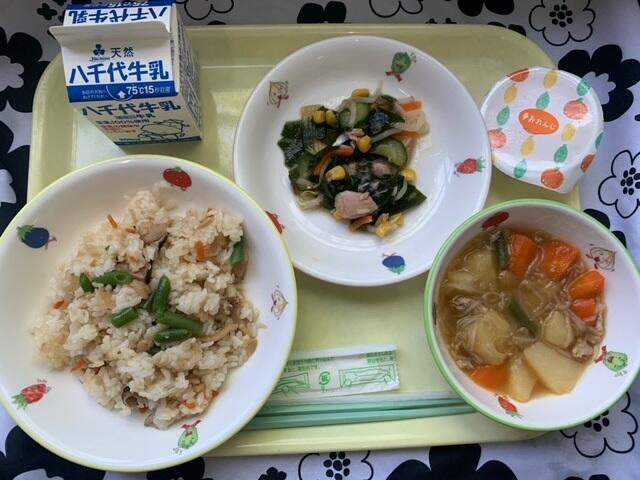 献立:五目ごはん、わかめサラダ、肉じゃが、オレンジゼリー(夢オレンジ)