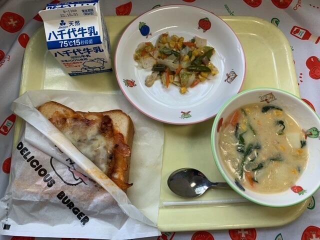 献立:ピザトースト、やさいソテー、米粉のコーンスープ