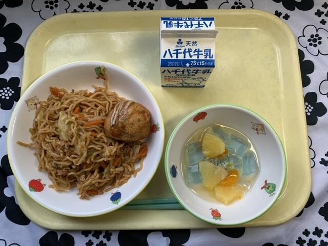 献立:やきそば、じゃがたこやき、ソーダゼリーポンチ