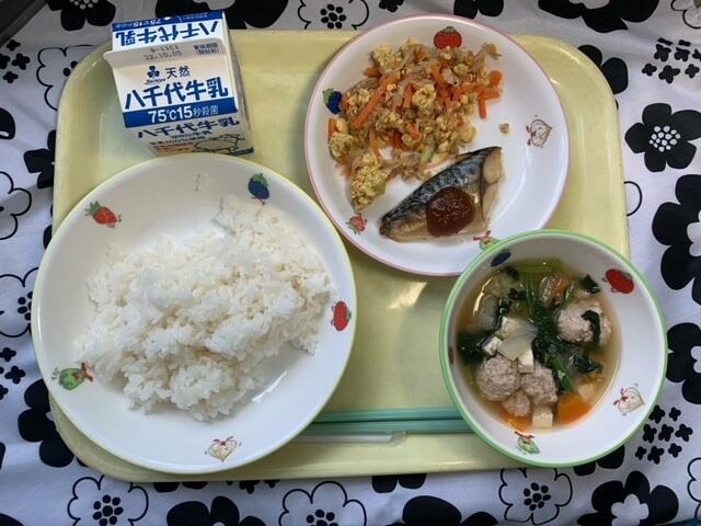 献立:ごはん、さばのみそだれがけ、にんじんしりしり、とりだんごスープ