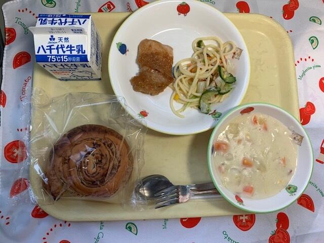 献立:チョコロールパン、市川梨を使ったバーベキューチキン、スパゲッティサラダ、ミルクチャウダー