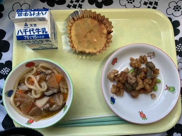 献立:にこみうどん、とりとごぼうの甘辛あげ、市川のなしのマドレーヌ