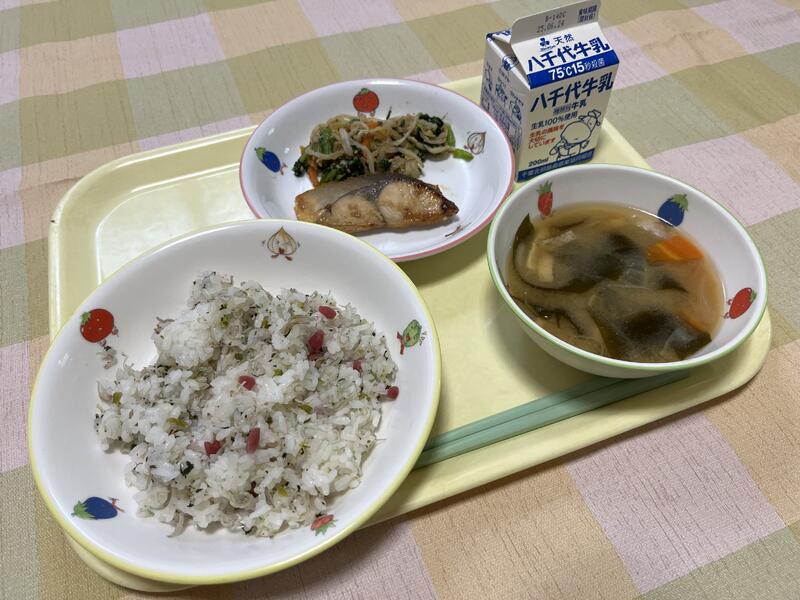 献立:じゃこ・梅青・青菜ごはん、いなだの西京焼き、ごま和え、 玉ねぎとわかめのみそ汁、牛乳