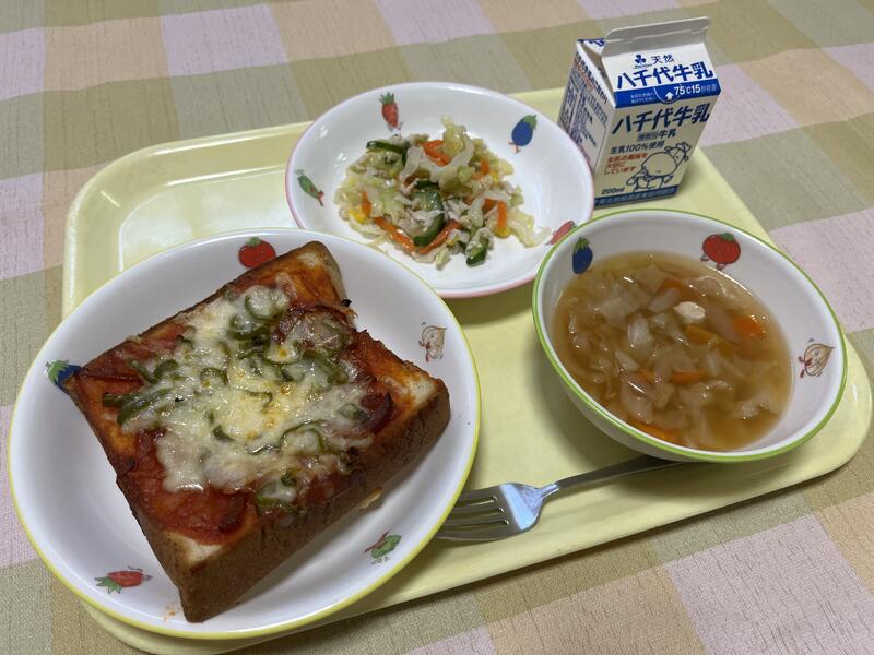 献立:ピザトースト、ハムサラダ、コンソメスープ、牛乳