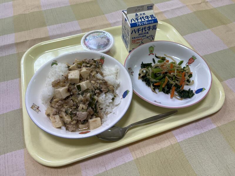 献立:ごはん、マーボー豆腐、ナムル、あじさいゼリー、牛乳